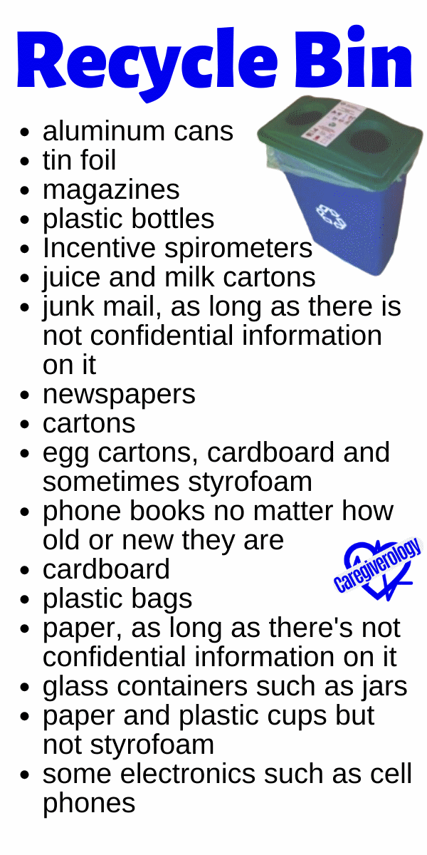 Standard waste binHere is a list of items that go into a standard waste bin when you are ready to dispose of it. This list is the same at home, in a nursing home, as well as a hospital. Some are a given while others, not so much.