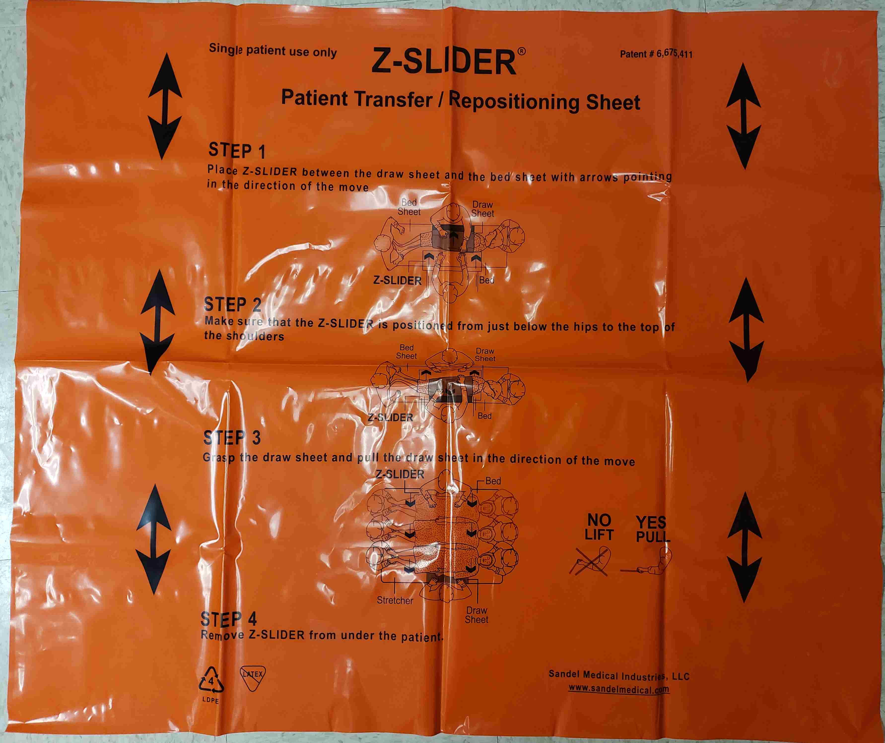A z-slider is a patient transfer sheet. It is used similarly to the way a draw sheet or an incontinence pad can be used to help reposition or transfer a patient. It was made by the company Sandel. Their slogan is: "Leaders in healthcare safety" They have multiple products that were made for the medical field.
